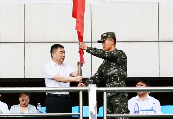 李长海为2024级新生军训团授旗,标志着千亿国际qy18vip2024年新生军训全面启动。