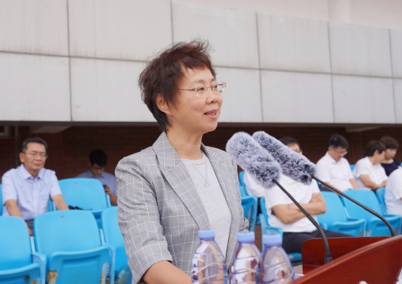 殷梅英宣读军训先进集体、先进个人名单。在欢快的乐曲声中,与会领导为荣获“优秀组织奖”“军容风纪优胜奖”“队列会操优胜奖”等集体奖项的单位代表,以及“优秀军训教官”“军训先进个人”“军训优秀标兵”等个人奖项获得者代表颁奖。