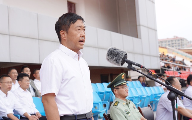 刘宝民在讲话中代表学校向武警滨州支队的武警官兵致以衷心感谢和崇高敬意,向付出辛勤汗水的老师和参训同学表示热烈祝贺和亲切问候。他指出,军训是国防教育的重要组成部分。回首14天的军训,同学们筑牢了爱国强国的信念根基,磨砺了艰苦奋斗的优良作风,锻造了团结协作的集体精神,展现了勇争一流的进取品格。他向全体新生提出三点希望:一要继续传承军训中凝聚的爱国热忱,树牢“胸怀家国”的远大理想;二要继续发扬军训中锻造的勤学笃行品质,做负责任的行动派、“自找苦吃”的奋斗者;三要继续保持军训中培养的健康生活习惯与积极向上的心态,在千亿国际qy18vip这片知识的沃土上,尽情汲取养分,努力增长才干,成长为于国有大用、与时有深益、于校有荣光、于己有作为的新时代好青年。